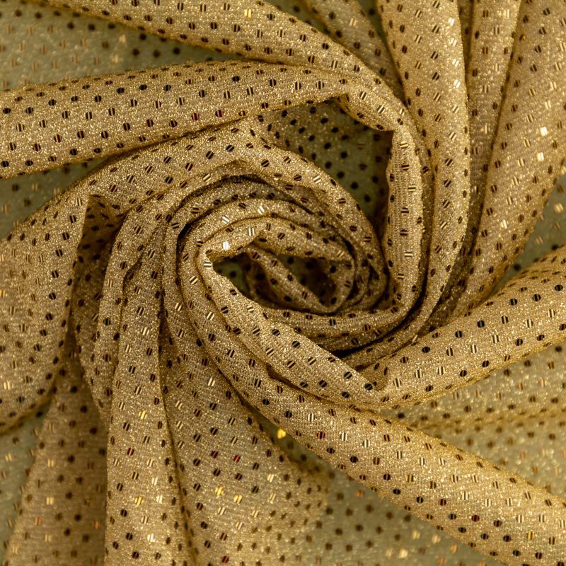 Трикотаж золотистого цвета с люрексовой нитью и мелкими пайетками. Мягкая и эластичная ткань, великолепно драпируется и красиво облегает. Тонкий, просвечивает, требуется подклад. Прекрасно подходит для изделий по фигуре, а также нарядов с мягкими складками. Трикотаж можно использовать для вечерних образов — платья, блузки, топы, кофточки и боди и для пошива танцевальных и сценических костюмов.