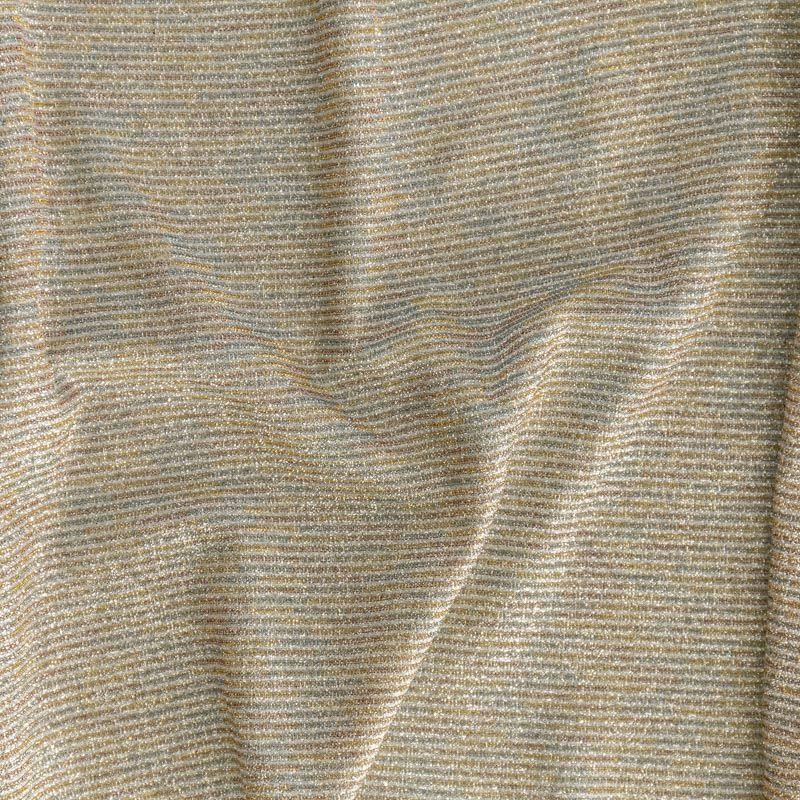 Мягкое и эффектное трикотажное полотно с металлизированным напылением. Структура полотна плотная, легко растяжимая, эластичная. С лицевой стороны поверхность ткани  слегка шероховатая на ощупь, характеризуется заметным блеском «металлик». С изнанки трикотаж гладкий, комфортный, подходит для использования без подклада. Отлично пододет для пошива водолазки, платья, топа, леггинсов, спортивных купальников, нарядных изделий.