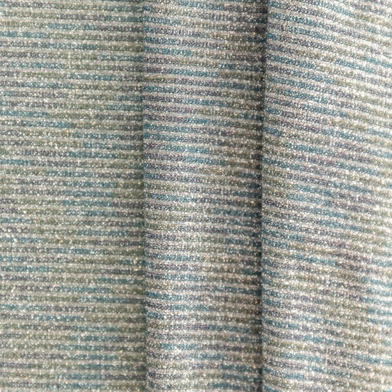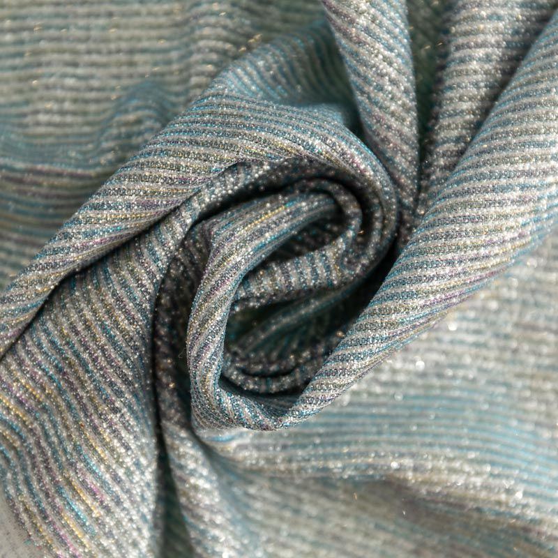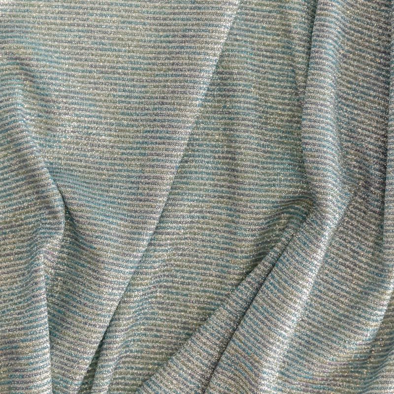 Мягкое и эффектное трикотажное полотно с металлизированным напылением. Структура полотна плотная, легко растяжимая, эластичная. С лицевой стороны поверхность ткани  слегка шероховатая на ощупь, характеризуется заметным блеском «металлик». С изнанки трикотаж гладкий, комфортный, подходит для использования без подклада. Отлично пододет для пошива водолазки, платья, топа, леггинсов, спортивных купальников, нарядных изделий.