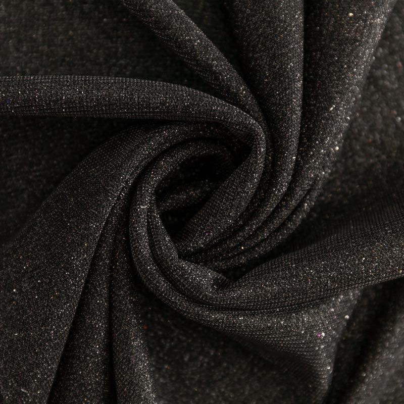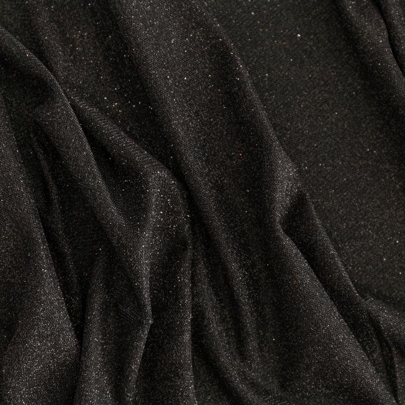 Мягкое и эффектное трикотажное полотно с металлизированным напылением. Структура полотна плотная, легко растяжимая, эластичная. С лицевой стороны поверхность ткани  слегка шероховатая на ощупь, характеризуется заметным блеском «металлик». С изнанки трикотаж гладкий, комфортный, подходит для использования без подклада. Отлично пододет для пошива водолазки, платья, топа, леггинсов, спортивных купальников, нарядных изделий.