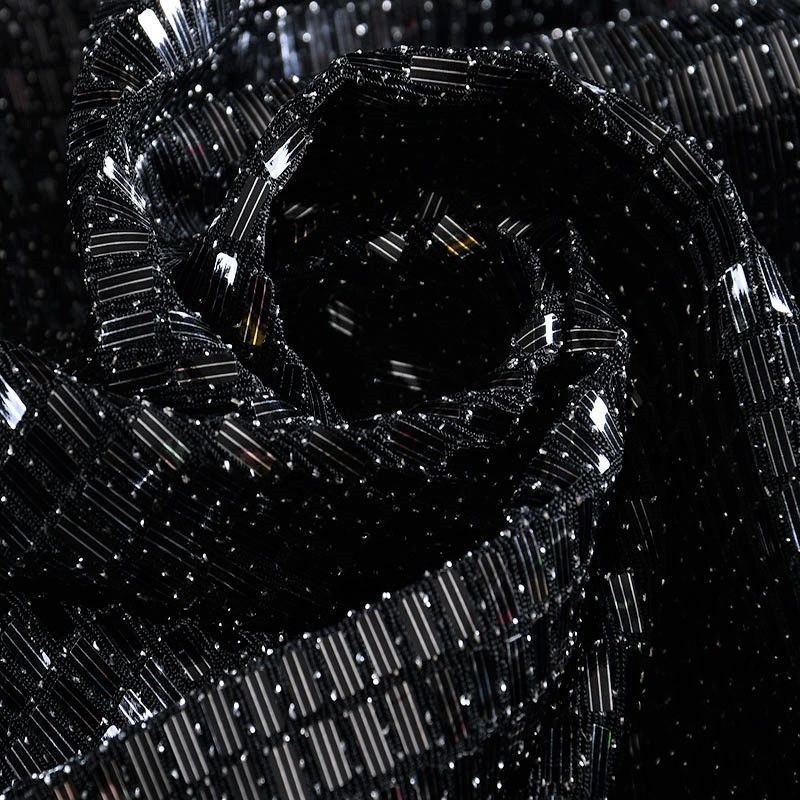 Трикотажное черное полотно с блестящими глянцевыми пайетками и серебристой люрексной нитью. Декор накатан на основу, поэтому будет комфортен в носке. Ткань пластичная, прекрасно драпируется и укладывается в складки, легко садится по фигуре за счёт основы с эластаном, не прозрачная, позволит шить изделия без подклада. Идеально подойдет для пошива нарядных вечерних образов: платья, юбки, топа, туники, широких брюк, жакета, кардигана.