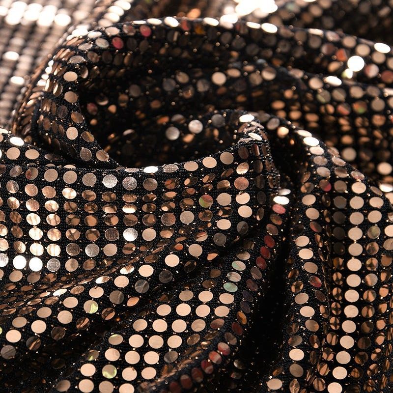 Трикотажное черное полотно с блестящими зеркальными золотистыми круглыми пайетками. Декор накатан на основу, поэтому будет комфортен в носке. Ткань пластичная, прекрасно драпируется и укладывается в складки, легко садится по фигуре за счёт основы с эластаном, не прозрачная, позволит шить изделия без подклада. Идеально подойдет для пошива нарядных вечерних образов: платья, юбки, топа, туники, широких брюк, жакета, кардигана.