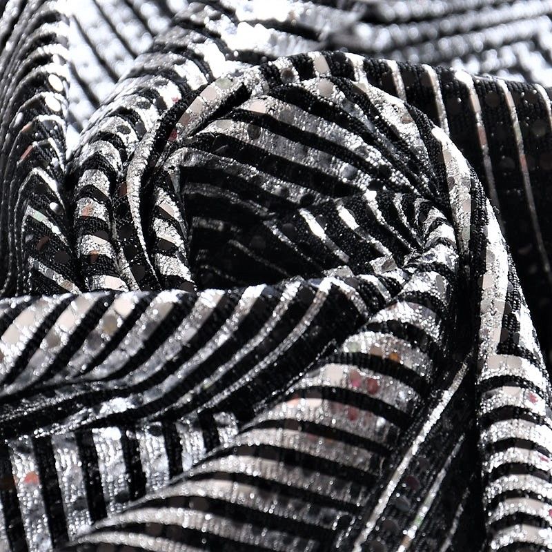 Трикотажное черное полотно серебристым геометрическим узором и деликатными прозрачными круглыми пайетками. Декор накатан на основу, поэтому будет комфортен в носке. Ткань пластичная, прекрасно драпируется и укладывается в складки, легко садится по фигуре за счёт основы с эластаном, не прозрачная, позволит шить изделия без подклада. Идеально подойдет для пошива нарядных вечерних образов: платья, юбки, топа, туники, широких брюк, жакета, кардигана.