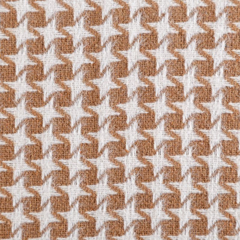 Костюмный твид с карамельного оттенка с геометрическим узором молочного цвета. Ткань плотная, мягкая, приятная на ощупь, прочная, не вытирается. Отличный выбор для осенних костюмов, облегченного пальто, куртки, бомбера, юбки, шорт или теплого платья.