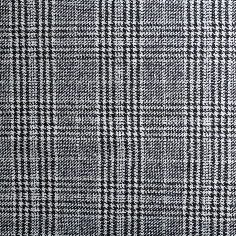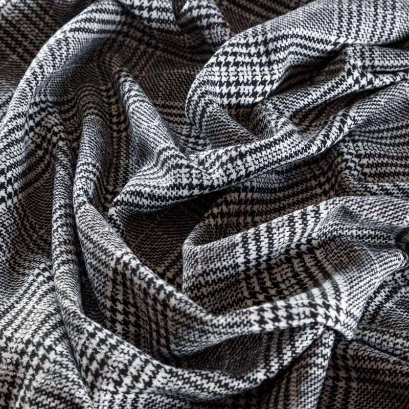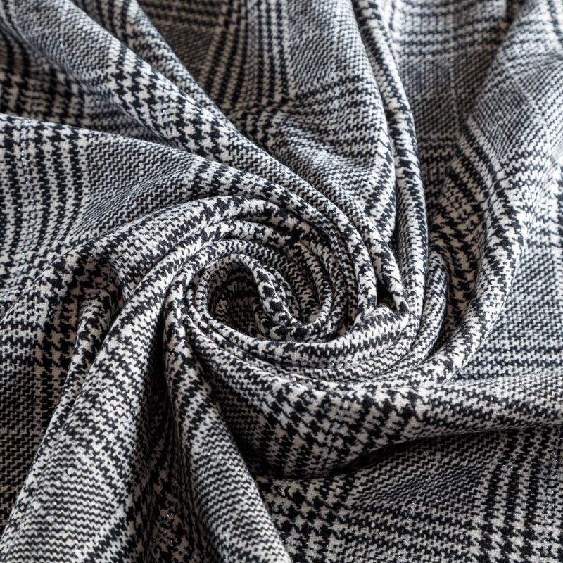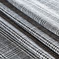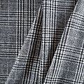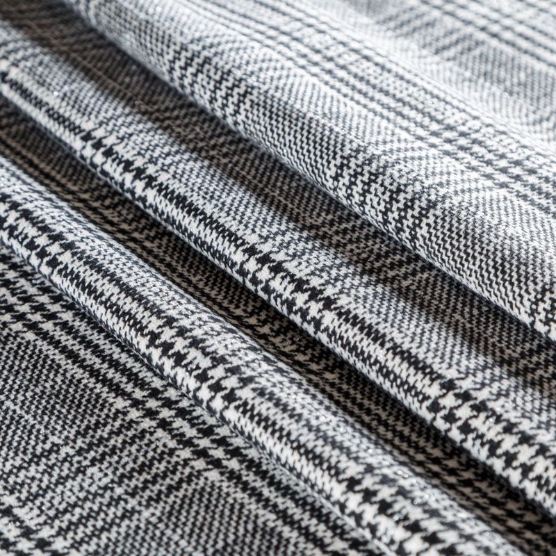 Плотная твидовая ткань с добавлением шерсти, мягкая и приятная на ощупь, формоустойчива, хорошо драпируется. Переплетение нитей черного и белого цветов в узоре "гусиная лапка" и люрексной нити образует сложную красивую клетку тартан. Ткань отлично подойдет для пошива пальто, теплых костюмов, юбки, шорт, жакета, кейпа, жилета.