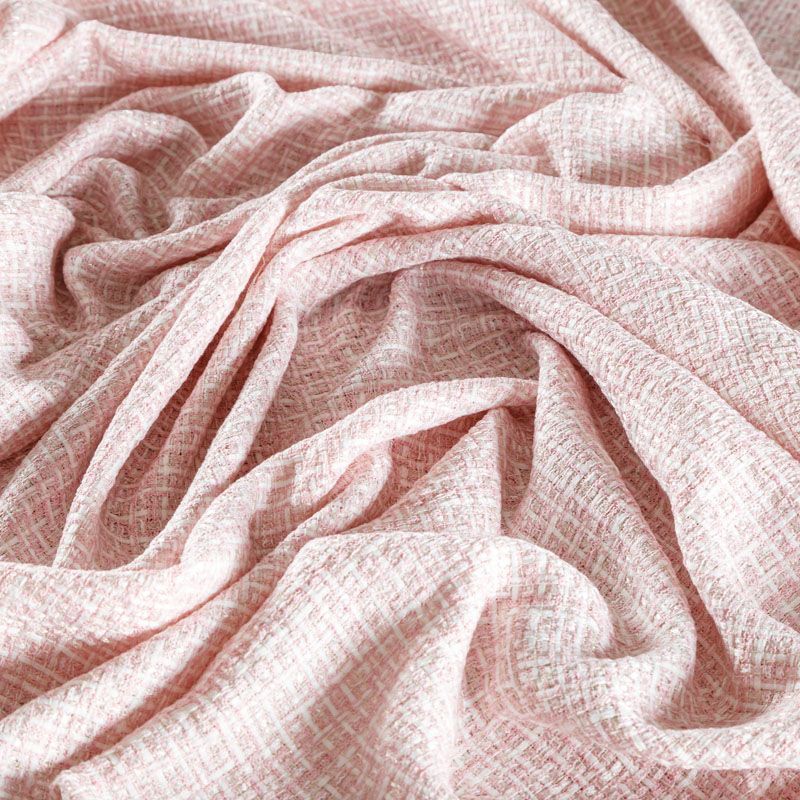 Отличительная особенность этой ткани в полотняном плетении нитей, характерного для рогожки, олицетворяющая сложную "клетчатую" геометрию в розово-молочных оттенках. Различная толщина нитей создает эффектную фактуру. Ткань достаточно формоустойчивая, при этом пластичная, гибкая за счет плетения,  матовая, мягкая, приятная на ощупь, не рыхлая. Прекрасно подойдет для пошива жакета, юбки в виде трапеции, легкого пальто, костюма.