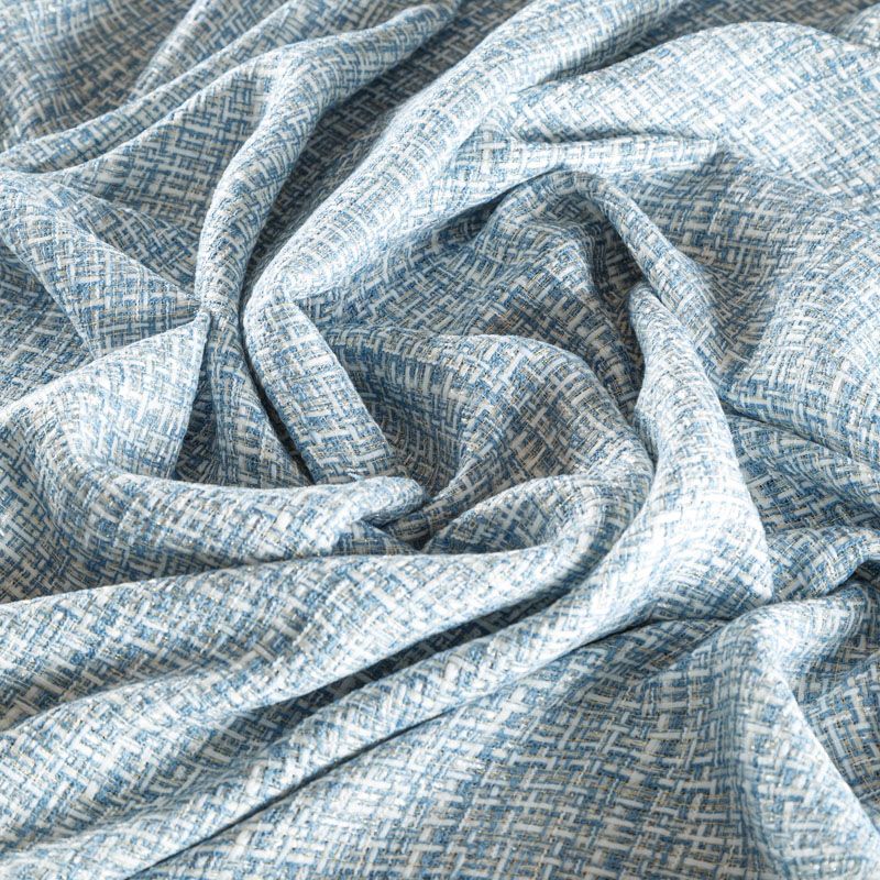 Отличительная особенность этой ткани в полотняном плетении нитей, характерного для рогожки, олицетворяющая сложную "клетчатую" геометрию в бело-голубых оттенках. Различная толщина нитей создает эффектную фактуру. Ткань достаточно формоустойчивая, при этом пластичная, гибкая за счет плетения, матовая, мягкая, приятная на ощупь, не рыхлая. Прекрасно подойдет для пошива жакета, юбки в виде трапеции, легкого пальто, костюма.
