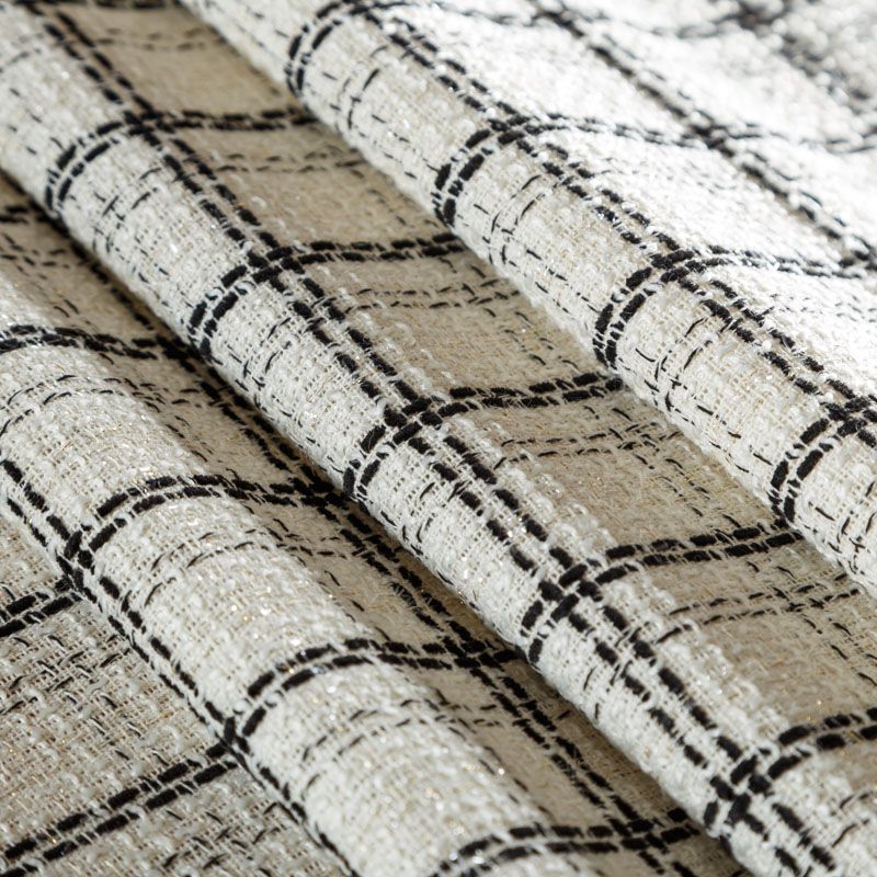 Мягкая, пластичная и объемная ткань, с разреженной и рельефной вывязанной структурой. Буклированный твид в стиле Шанель буквально соткан из различных по толщине и текстуре нитей, образующих рисунок в виде клетки. В плетение добавлена блестящая люрексная нить. Твид идеально подходит для пошива платьев, юбок, жакетов, легких пальто, эффектных бомберов и курток.