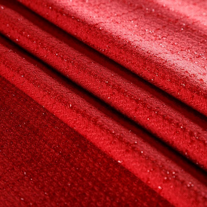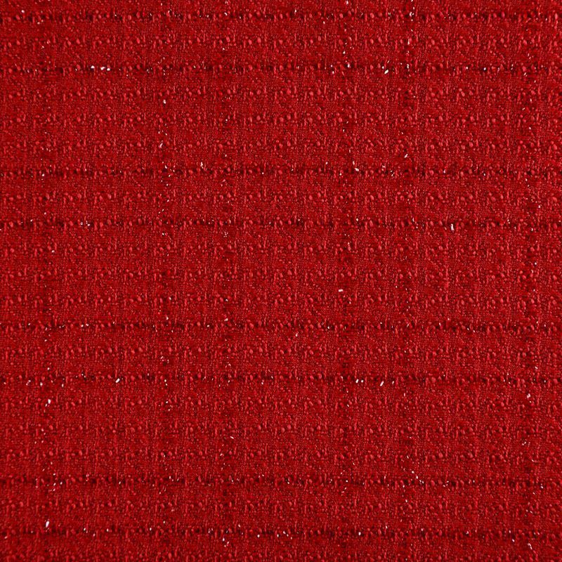 Твид средней плотности с рельефной поверхностью красного оттенка с добавлением акцента в виде люрексовой нити, которая имитирует клетку и добавляет ткани нарядности. Твид пластичный, хорошо драпируется, умеренно держит форму, прекрасно подойдет для пошива жакетов на подкладе, жилетов, кардиганов, легких пальто, юбок и платьев.