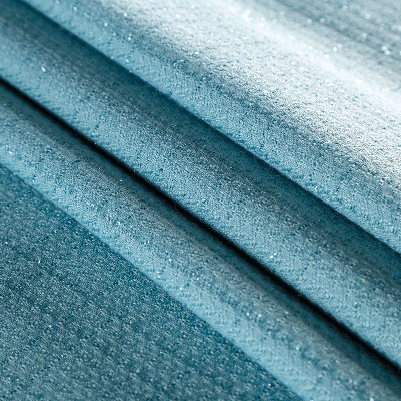 Твид средней плотности с рельефной поверхностью бирюзового оттенка с добавлением акцента в виде люрексовой нити, которая имитирует клетку и добавляет ткани нарядности. Твид пластичный, хорошо драпируется, умеренно держит форму, прекрасно подойдет для пошива жакетов на подкладе, жилетов, кардиганов, легких пальто, юбок и платьев.