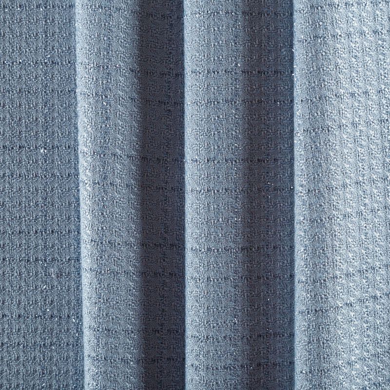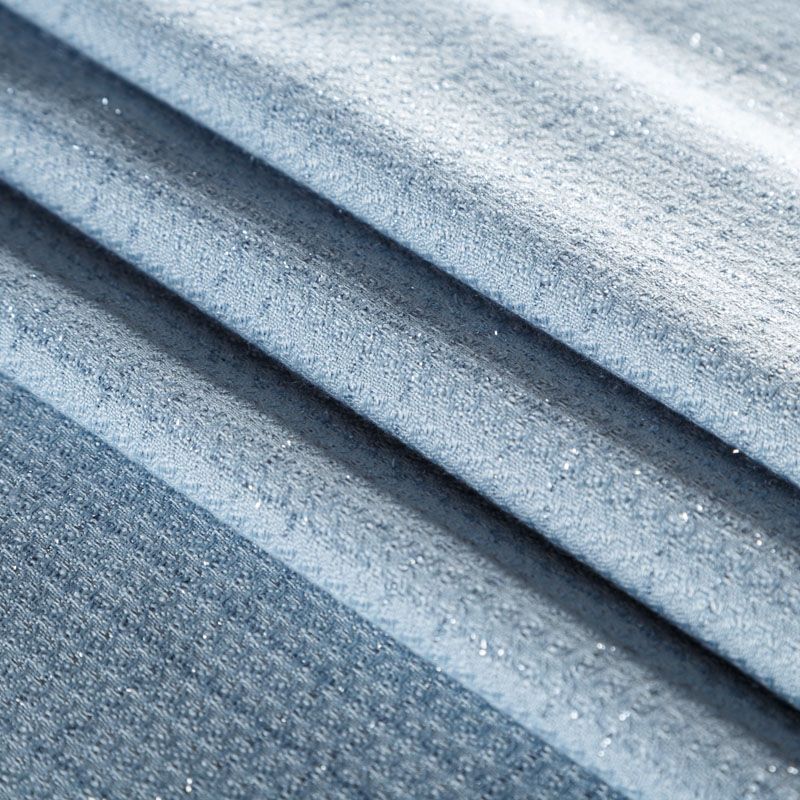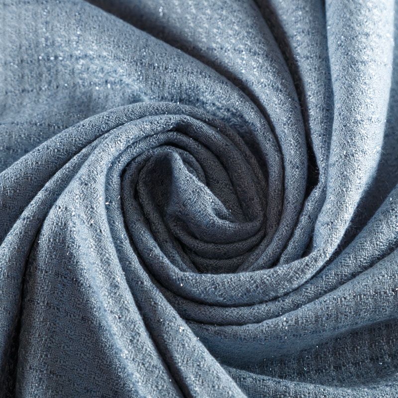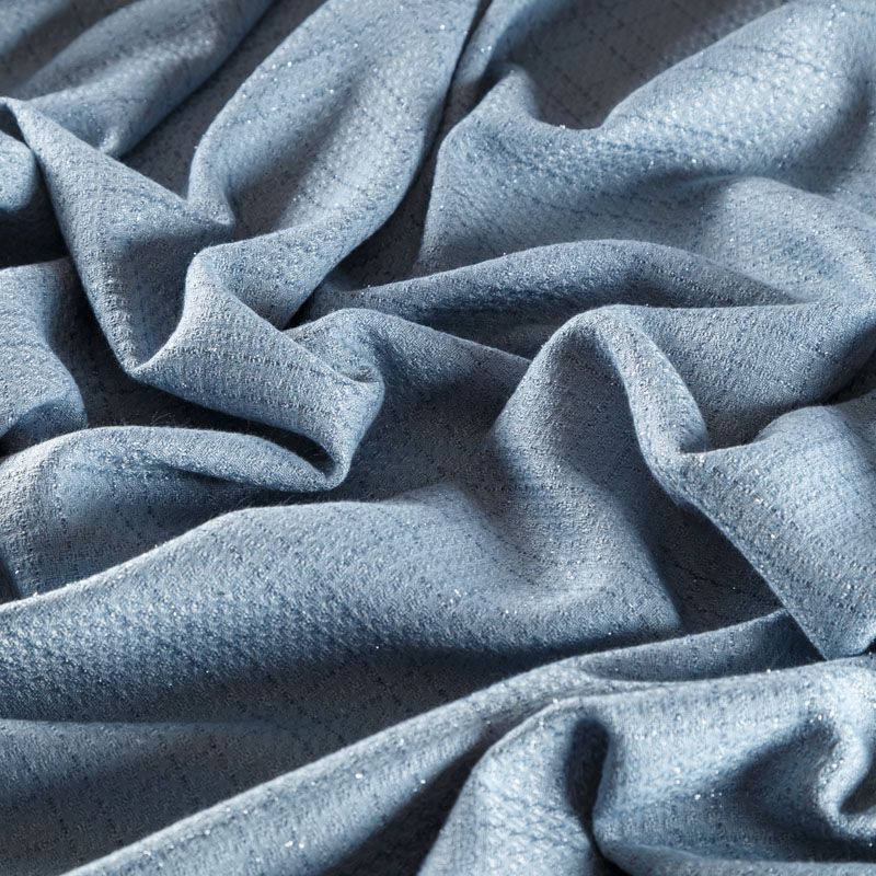 Твид средней плотности с рельефной поверхностью серо-голубого оттенка с добавлением акцента в виде люрексовой нити, которая имитирует клетку и добавляет ткани нарядности. Твид пластичный, хорошо драпируется, умеренно держит форму, прекрасно подойдет для пошива жакетов на подкладе, жилетов, кардиганов, легких пальто, юбок и платьев.