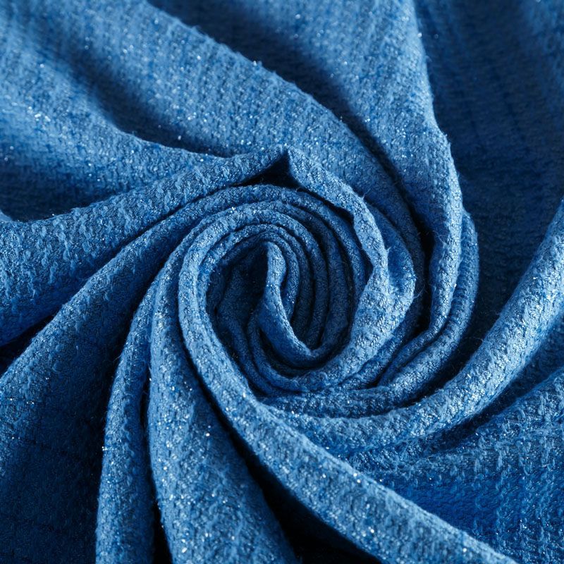 Твид средней плотности с рельефной поверхностью голубого оттенка с добавлением акцента в виде люрексовой нити, которая имитирует клетку и добавляет ткани нарядности. Твид пластичный, хорошо драпируется, умеренно держит форму, прекрасно подойдет для пошива жакетов на подкладе, жилетов, кардиганов, легких пальто, юбок и платьев.