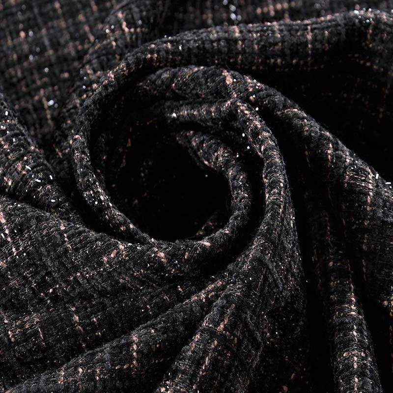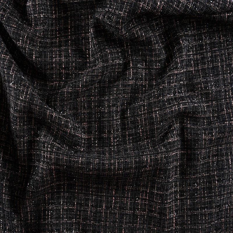 Мягкая, пластичная и объемная ткань, с разреженной и рельефной вывязанной структурой. Буклированный твид в стиле Шанель буквально соткан из различных по толщине и текстуре нитей, образующих рисунок в виде клетки. В плетение добавлена блестящая люрексная нить. Твид идеально подходит для пошива платьев, юбок, жакетов, легких пальто, эффектных бомберов и курток.