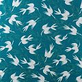 Итальянский вискозный твил-штапель со стилизованным принтом в виде летящих птици темно-бирюзового оттенка. Мягкая ткань средней плотности, имеет саржевое плетение и характерный диагональный рубчик на поверхности. Хорошо сохраняет форму, не сильно мнется и не деформируется в процессе эксплуатации. Красиво ложится в складки, поэтому прекрасно подойдет на длинные драпированные юбки и платья, туники, на свободные брюки или шорты, топы.