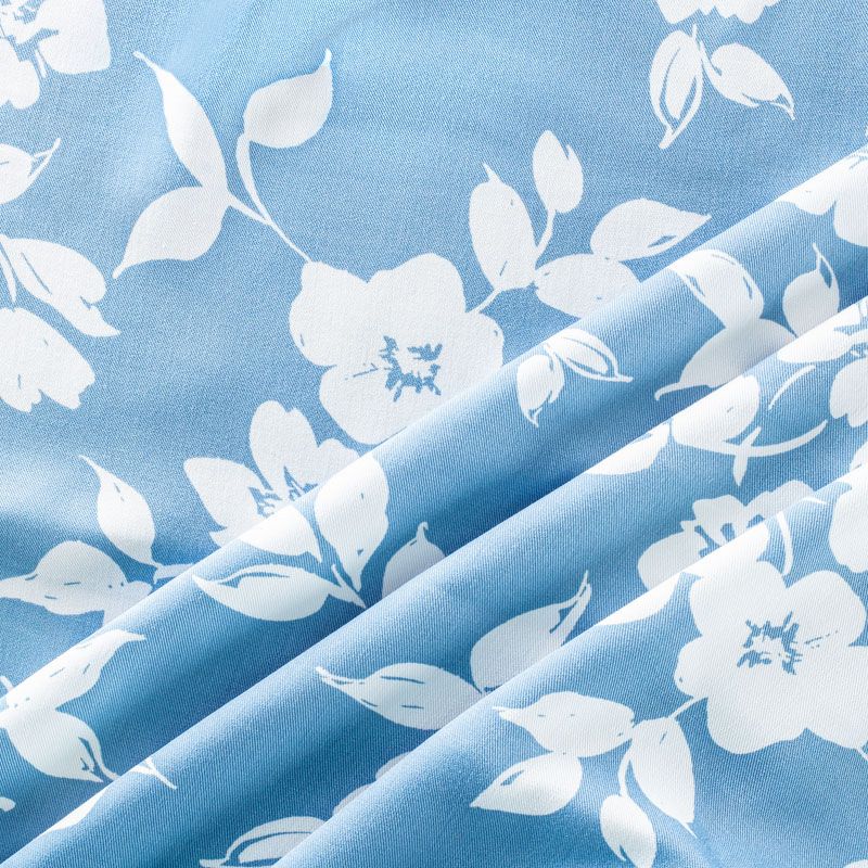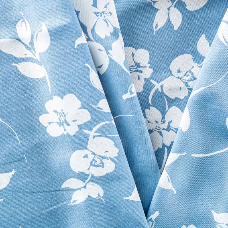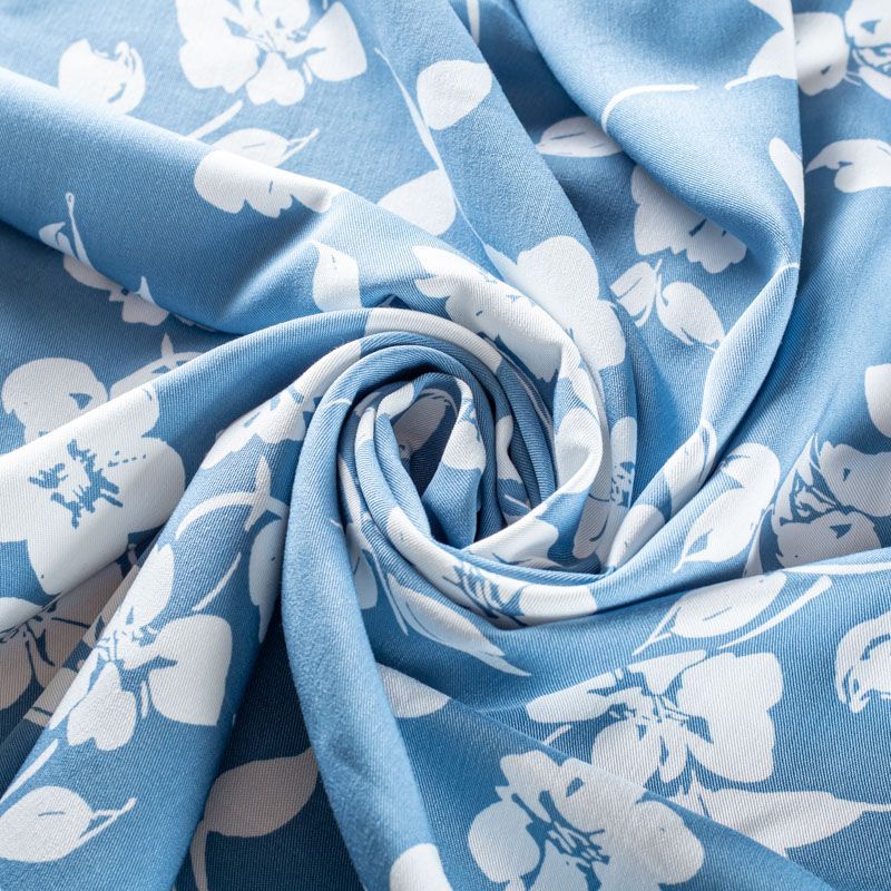 Качественный твил-штапель с белым цветочным принтом на серо-голубом фоне. Мягкая ткань средней плотности, имеет саржевое плетение и характерный диагональный рубчик на поверхности. Хорошо сохраняет форму, не сильно мнется и не деформируется в процессе эксплуатации.  Красиво ложится в складки, поэтому прекрасно подойдет на длинные драпированные юбки и платья, на свободные брюки или шорты, топы.