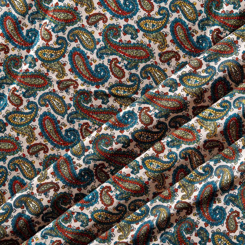 Плотная и мягкая ткань оттенка экрю с цветным узором пейсли, имеет саржевое плетение и характерный диагональный рубчик на поверхности. Отлично сохраняет форму, не сильно мнется и не деформируется в процессе эксплуатации. Красиво ложится в складки, поэтому прекрасно подойдет на длинные драпированные юбки и платья, на свободные брюки или шорты, топы.