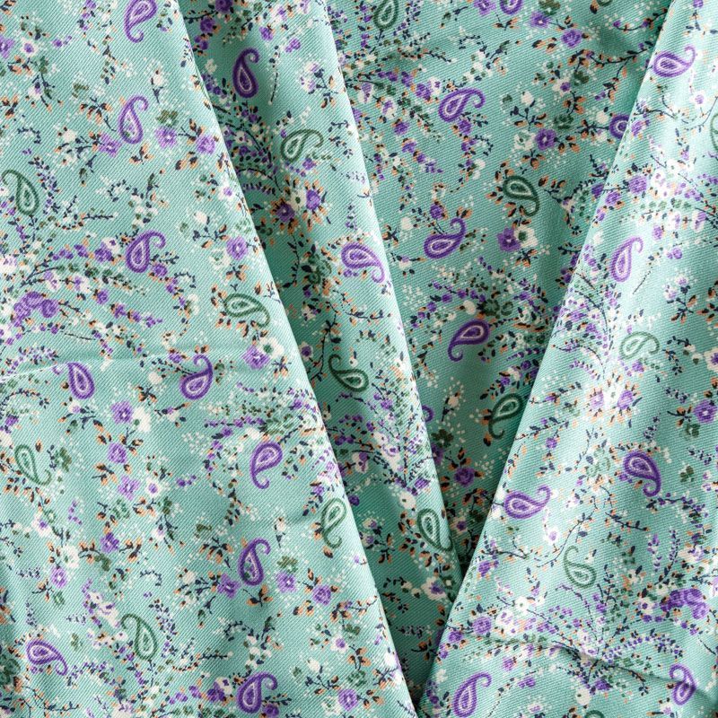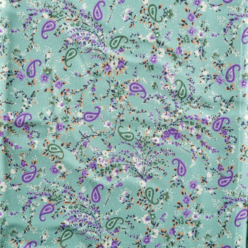 Плотная и мягкая ткань мятно-бирюзового оттенка с ярким мелкоцветом, имеет саржевое плетение и характерный диагональный рубчик на поверхности. Отлично сохраняет форму, не сильно мнется и не деформируется в процессе эксплуатации. Красиво ложится в складки, поэтому прекрасно подойдет на длинные драпированные юбки и платья, на свободные брюки или шорты, топы.