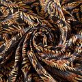 Плотная и мягкая ткань черного цвета с фантазийным принтом, имеет саржевое плетение и характерный диагональный рубчик на поверхности. Отлично сохраняет форму, не сильно мнется и не деформируется в процессе эксплуатации. Красиво ложится в складки, поэтому прекрасно подойдет на длинные драпированные юбки и платья, на свободные брюки или шорты, топы.