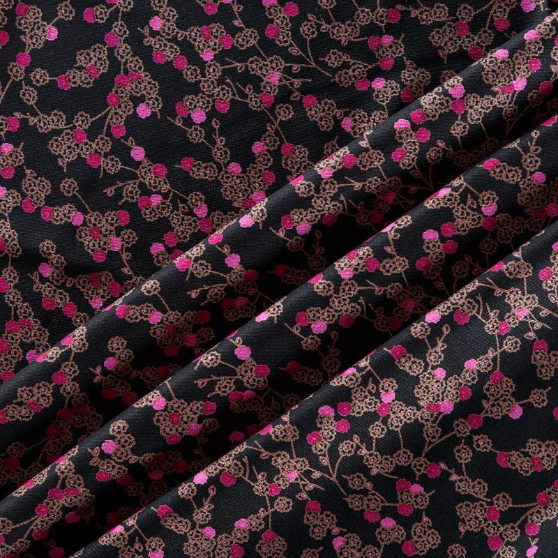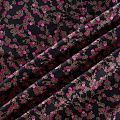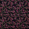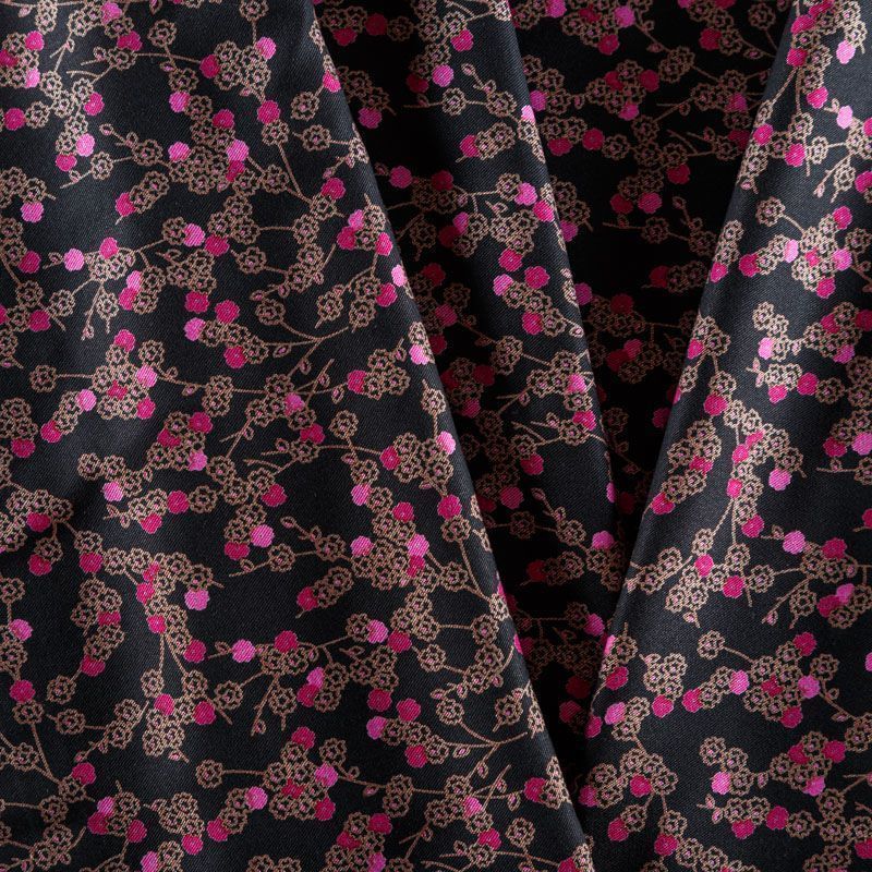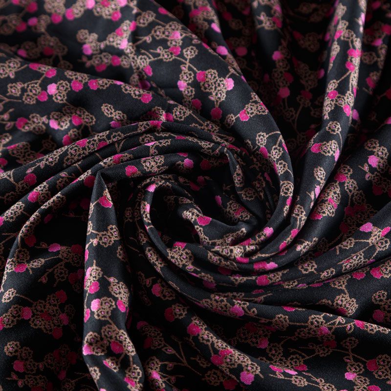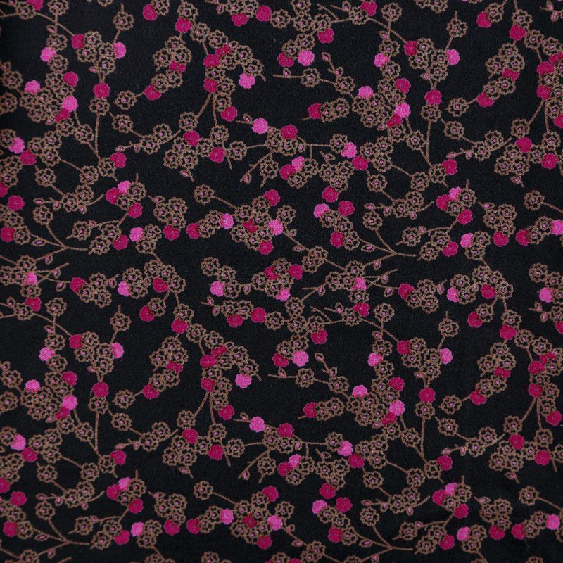 Плотная и мягкая ткань черного цвета с ярким мелкоцветом, имеет саржевое плетение и характерный диагональный рубчик на поверхности. Отлично сохраняет форму, не сильно мнется и не деформируется в процессе эксплуатации. Красиво ложится в складки, поэтому прекрасно подойдет на длинные драпированные юбки и платья, на свободные брюки или шорты, топы.