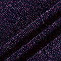 Плотная и мягкая ткань фиолетово-синего оттенка с хаотичным мелким принтом цвета фуксии, имеет саржевое плетение и характерный диагональный рубчик на поверхности. Отлично сохраняет форму, не сильно мнется и не деформируется в процессе эксплуатации. Красиво ложится в складки, поэтому прекрасно подойдет на длинные драпированные юбки и платья, на свободные брюки или шорты, топы.