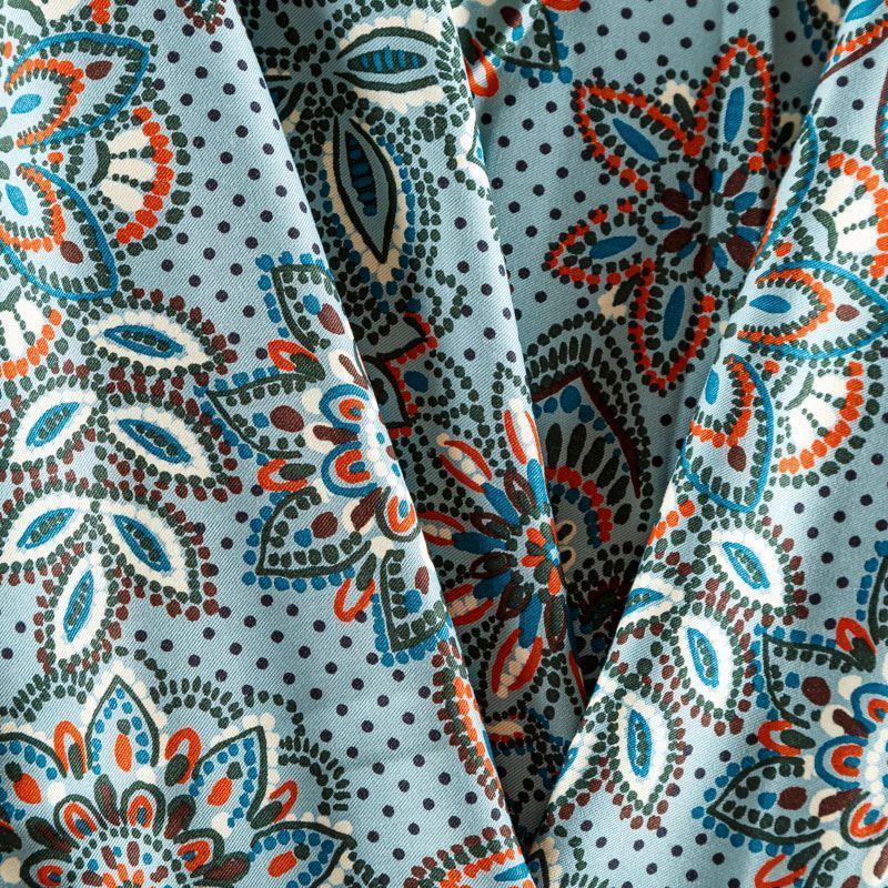 Плотная и мягкая ткань мятно-зеленого оттенка со стилизованным цветочным орнаментом, имеет саржевое плетение и характерный диагональный рубчик на поверхности. Отлично сохраняет форму, не сильно мнется и не деформируется в процессе эксплуатации. Красиво ложится в складки, поэтому прекрасно подойдет на длинные драпированные юбки и платья, на свободные брюки или шорты, топы.