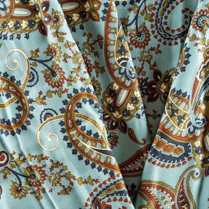 Плотная и мягкая ткань зеленого оттенка с оливково-коричневым узором пейсли, имеет саржевое плетение и характерный диагональный рубчик на поверхности. Отлично сохраняет форму, не сильно мнется и не деформируется в процессе эксплуатации. Красиво ложится в складки, поэтому прекрасно подойдет на длинные драпированные юбки и платья, на свободные брюки или шорты, топы.