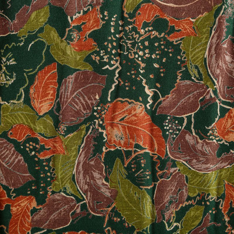 Плотная и мягкая ткань темно-зеленого цвета с растительным принтом в осенних оттенках, имеет саржевое плетение и характерный диагональный рубчик на поверхности. Отлично сохраняет форму, не сильно мнется и не деформируется в процессе эксплуатации. Красиво ложится в складки, поэтому прекрасно подойдет на длинные драпированные юбки и платья, на свободные брюки или шорты, топы, комбинезоны, а также для домашней одежды.