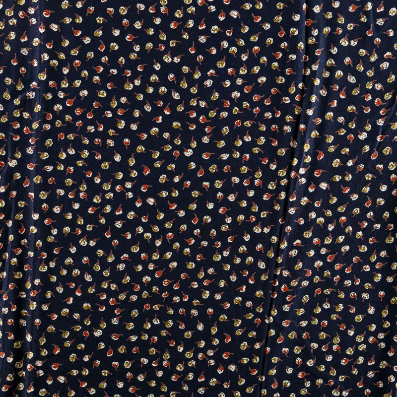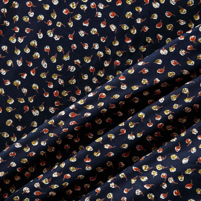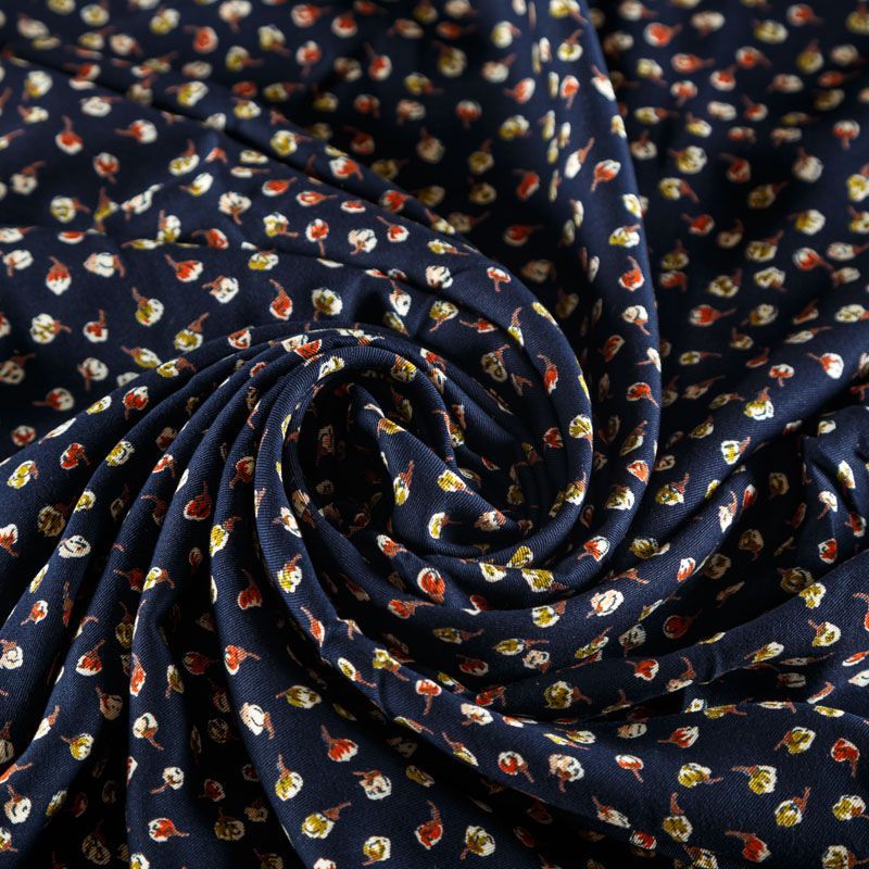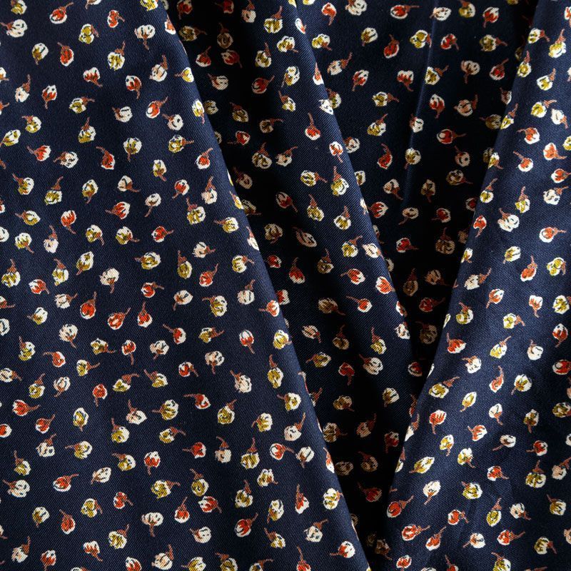 Плотная и мягкая ткань темно-синего оттенка с ярким мелкоцветом, имеет саржевое плетение и характерный диагональный рубчик на поверхности. Отлично сохраняет форму, не сильно мнется и не деформируется в процессе эксплуатации. Красиво ложится в складки, поэтому прекрасно подойдет на длинные драпированные юбки и платья, на свободные брюки или шорты, топы, комбинезоны, а также для домашней одежды.