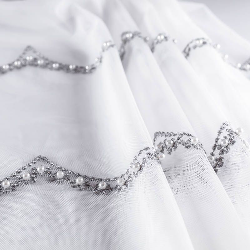 Сетка с вышивкой – это роскошный элемент дизайна, который преобразит любое помещение. Она отлично пропускает воздух, поэтому быстро сохнет после стирки. Прочная, ткань прослужит долго. Выдерживает большое количество стирок. Легкая, фактура ткани практически невесома, поэтому можно не опасаясь крепить ее даже на самый тонкий карниз. Нежная цветочная вышивка с круглыми бусинами серебристо-серого оттенка расположена ярусами, нижний край украшен вышитым фестоном, без утяжелителя, фигурный.