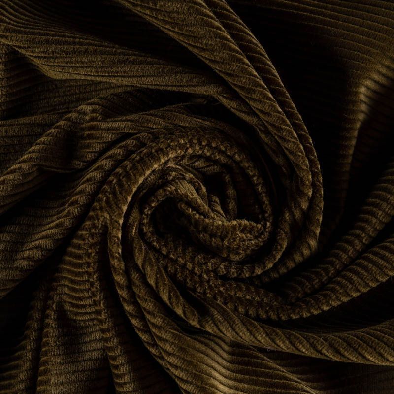 Итальянский костюмно-плательный вельвет из хлопка в благородном цвете хаки. Очень приятный тактильно, поверхность бархатистая, рубчик средней ширины, не тянется, не просвечивает. Подойдет для пошива костюма, куртки, жакета, платья, юбки, брюк или шорт.