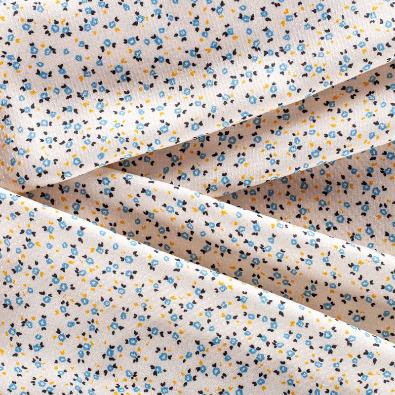 Итальянская жаккардовая вискоза сливочного оттенка с милыми стилизованными цветочками голубого цвета. Ткань тонкая, слегка просвечивает, отлично драпируется и струится, приятная на ощупь. Прекрасно подойдет для пошива платья, сарафана, топа, блузки, рубашки, юбки, пижамного костюма.