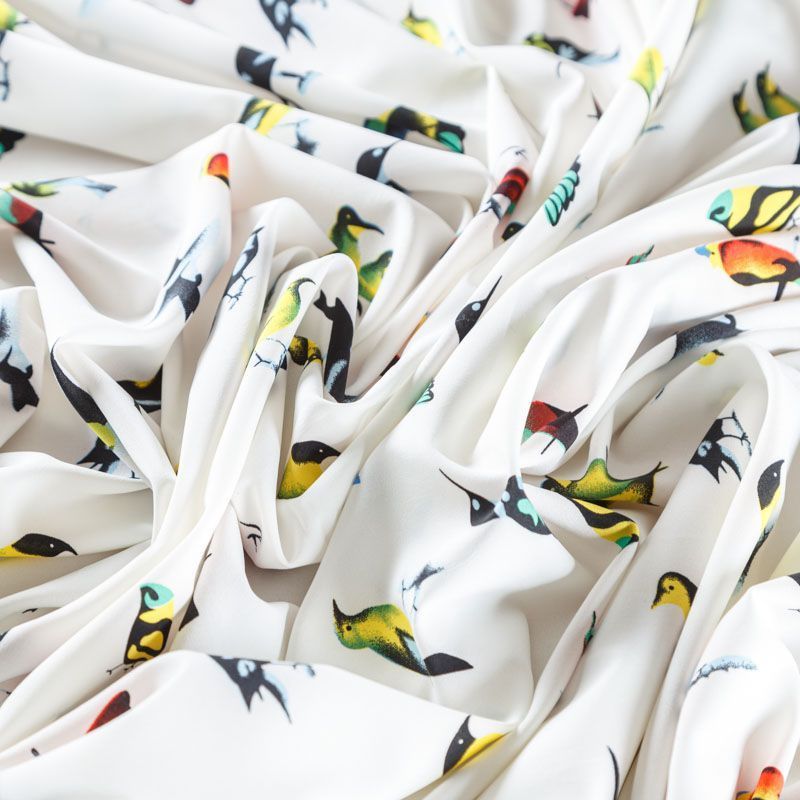 Легкая набивная ткань имеет высокую прочность, большую износоустойчивость. Материал упругий, мягкий, тянется за счет эластана в составе, хорошо драпируется, образует струящиеся складки. Идеально подойдет для пошива блуз, юбок, платьев, сарафанов.