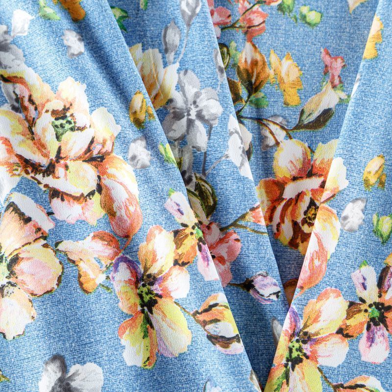 Это элегантная струящаяся ткань, которая превосходно драпируется, всегда изящно выглядит и остается легкой и воздушной,  имеет высокую прочность и большую износоустойчивость. Поверхность ткани матовая, гладкая и ровная, очень приятная на ощупь. Используется для пошива блуз, юбок, платьев, сарафанов, широких брюк.