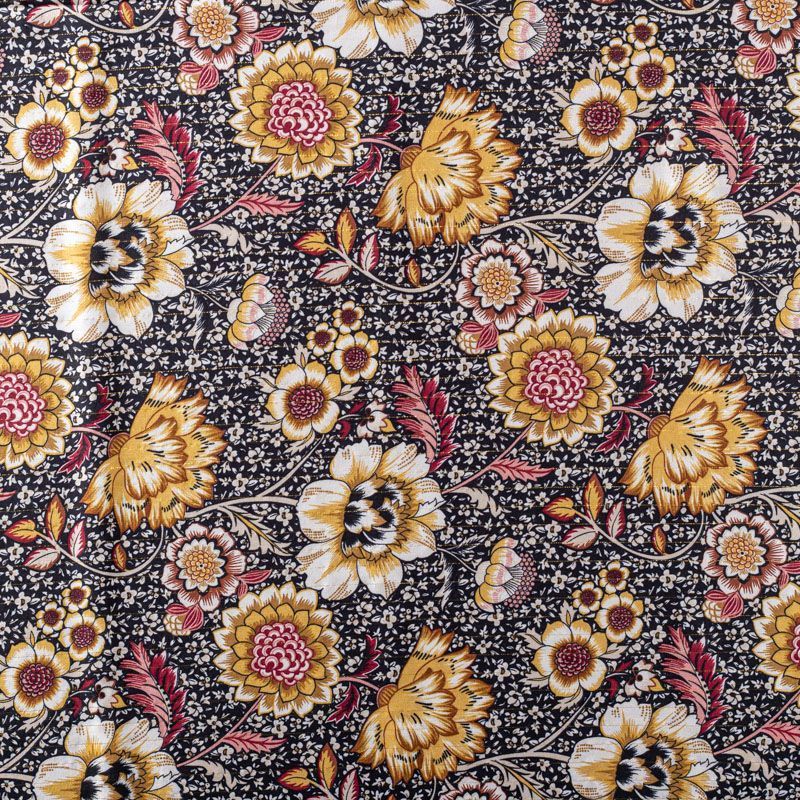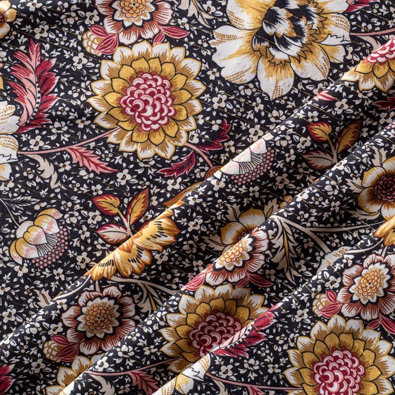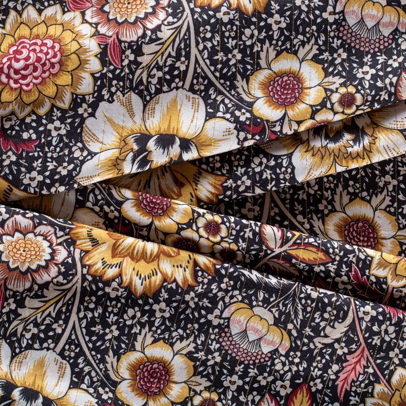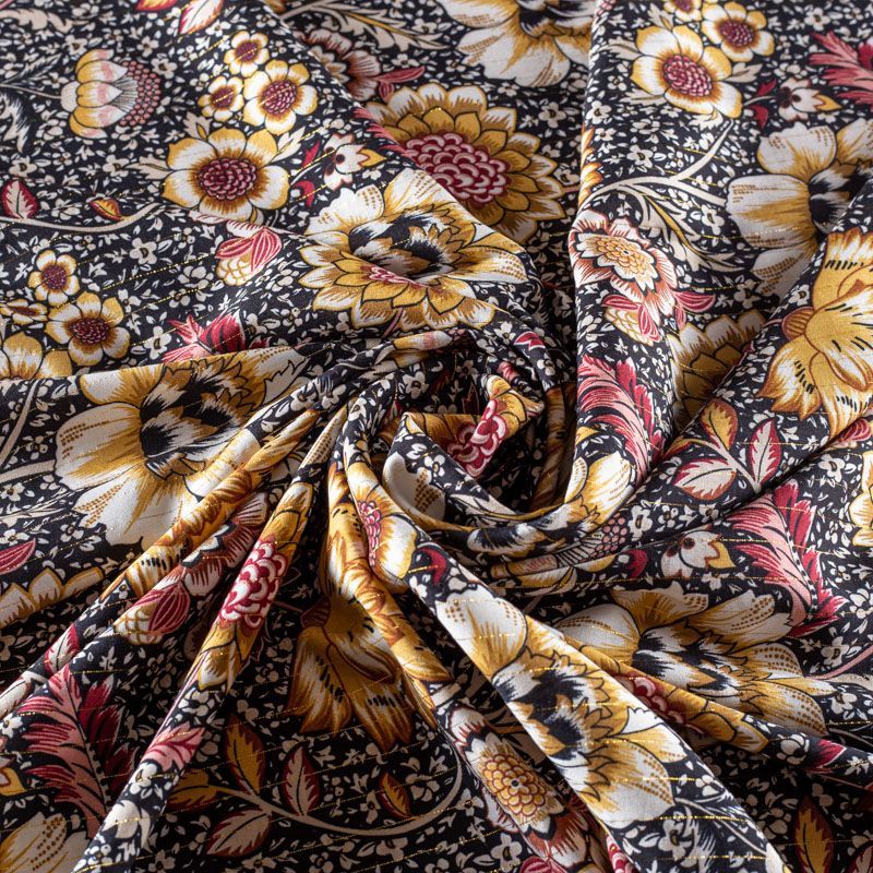 Итальянская плательно-блузочная вискоза с фантазийным цветочным принтом на черном фоне декорирована тонкой люрексовой полоской. Ткань очень пластичная, отлично драпируется и струится, мягкая и приятная на ощупь, не просвечивает. Прекрасно подойдет для пошива платья, топа, блузки, юбки.