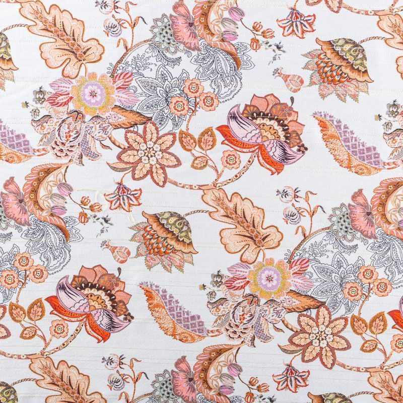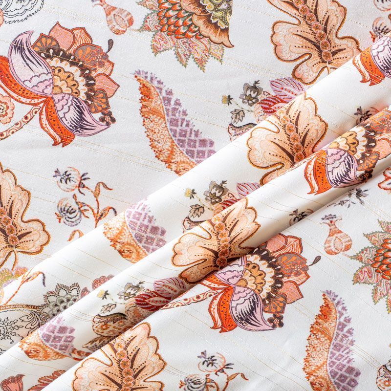 Итальянская плательно-блузочная вискоза с фантазийным цветочным принтом на молочном фоне декорирована тонкой люрексовой полоской. Ткань очень пластичная, отлично драпируется и струится, мягкая и приятная на ощупь, не просвечивает. Прекрасно подойдет для пошива платья, топа, блузки, юбки.