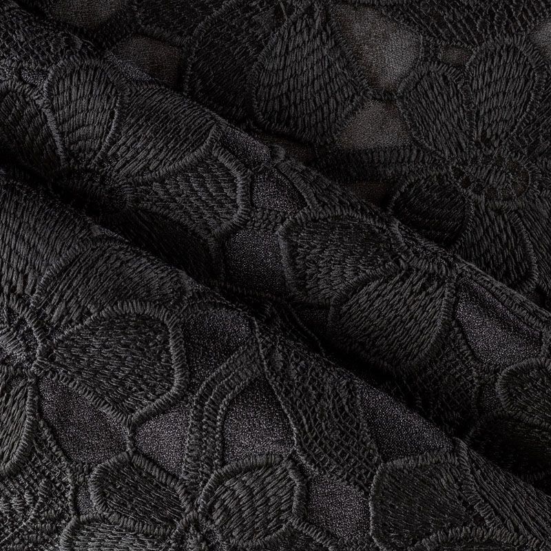 Очень эффектная вышивка на сетчатной основе черного цвета с мелкой ячейкой, мягкая и пластичная. Вышивка с цветочными мотивами в тон основе, плотная, расположена по всем полотну. Ткань приятная к телу, не колется, не цепляется. Идеальна для эффектных вечерних нарядов и для повседневного образа в виде платья-футляра, топа, блузки, летнего жакета, кардигана, брюк или шорт. Требуется подклад.