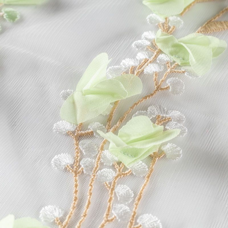 Необычная вышивка на сетке с 3D эффектом - воздушный, пластичный, трогательный купон на сетке основе молочного цвета. Оттенок смотрится благородно, а цветы из нежного шифона салатового цвета подвижны и создают весеннее настроение.