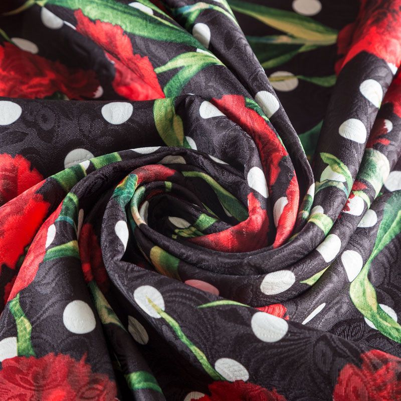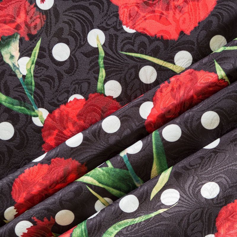 Нарядный жаккард черного цвета в белый горох в сочетании с яркими акцетными цветами, расположенными по всему полотну. Ткань плотная, хорошо драпируется и держит форму, с красивой фактурой, образованной жаккардовым плетением. Ткань обладает высокой прочностью, не мнется и не просвечивает. Идеально подходит для летнего пальто, кардигана, жакета, костюма, юбки или шорт.