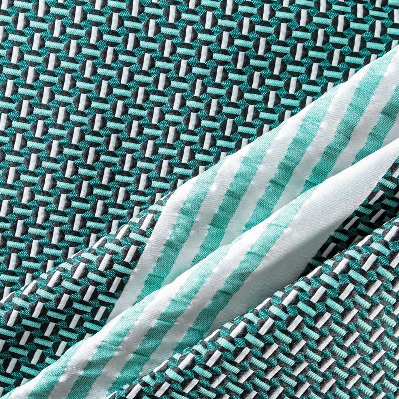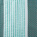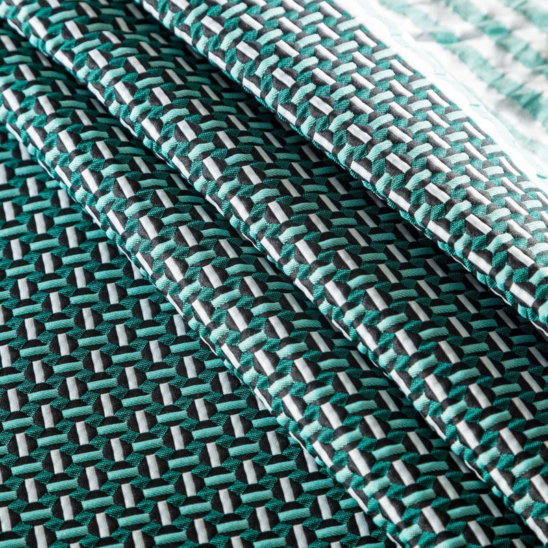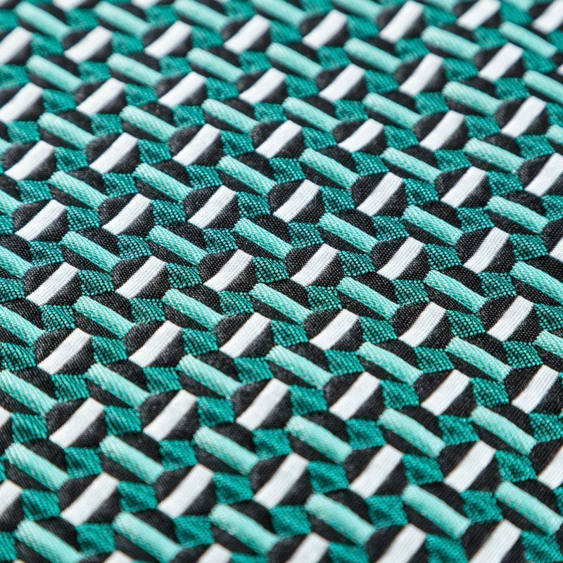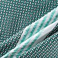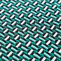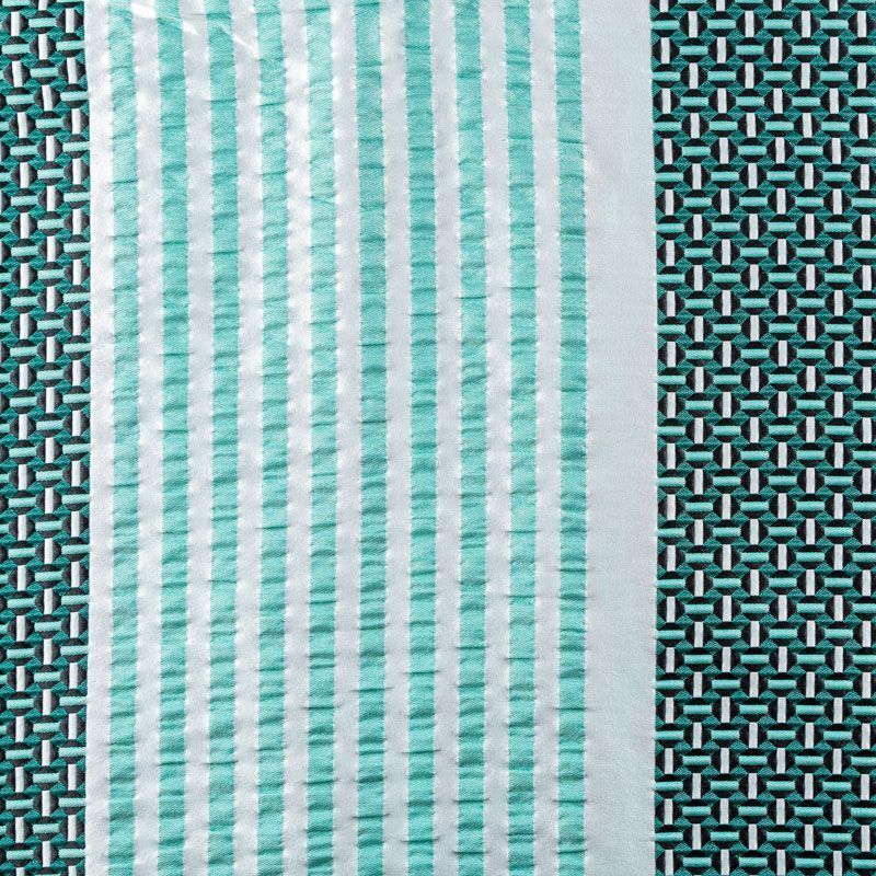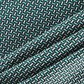Итальянский фактурный жаккардовый купон в бело-зеленых оттенках с мелким геометрическим дизайном. По нижнему краю купона расположены контрастные полосы. Ткань отлично держит форму, тянется за счет эластана в составе, практически не мнется.