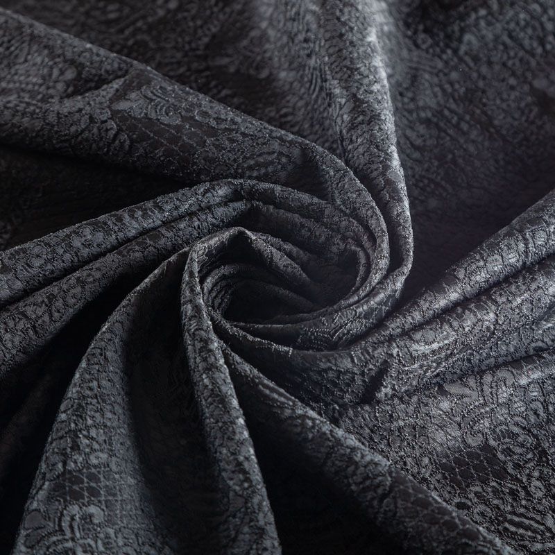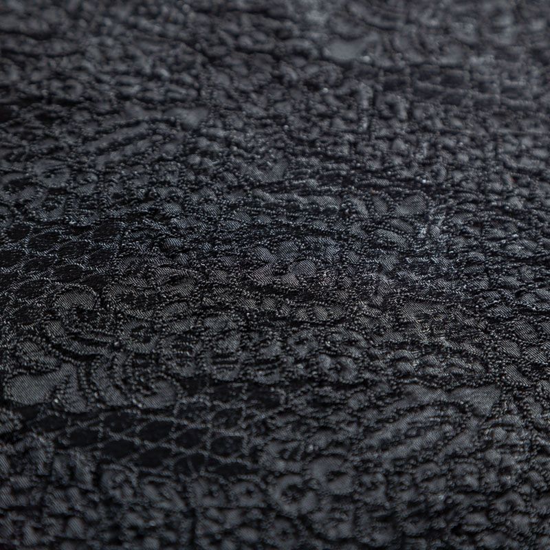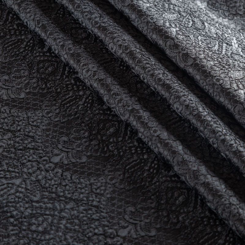 Итальянский жаккард с красивым сложным орнаментом черного цвета. Ткань легкая, но плотная, поверхность со сдержанным блеском объемная и текстурная, хорошо драпируется и держит форму, тянется за счет эластана в составе, не просвечивает. Подойдет для пошива нарядных вечерних костюмов, платьев-футляров в стиле Dior, жакетов, топов, легких пальто, бомберов, юбок или шорт.