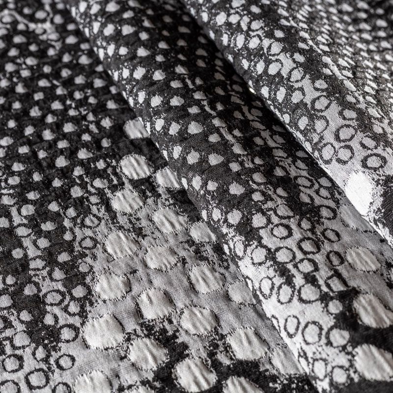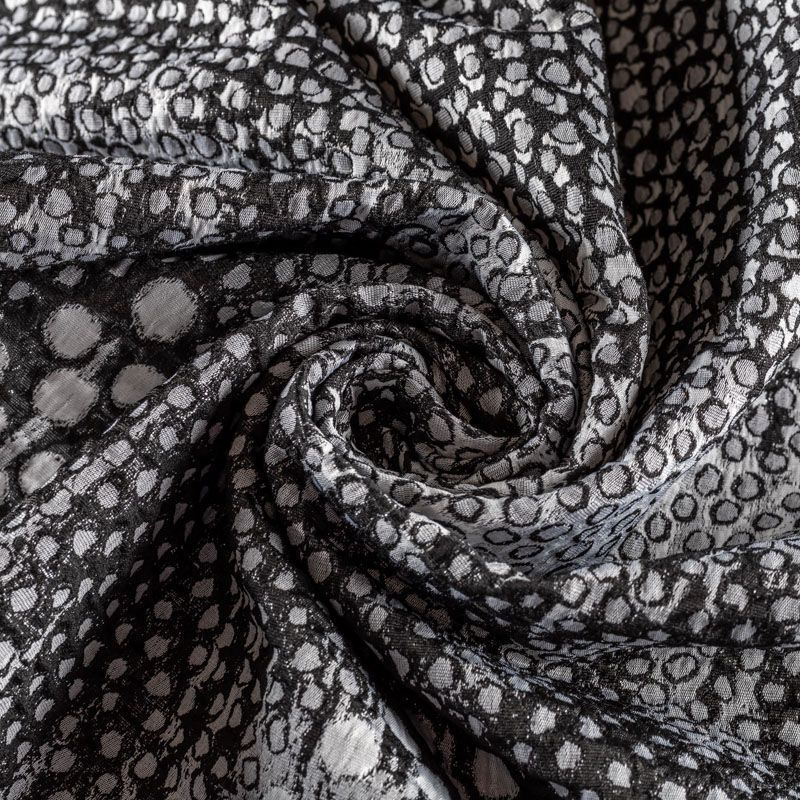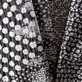 Итальянский купонный полушерстяной жаккард черного цвета с пестрым белым узором, который создает оригинальный объемный эффект. Фактура ткани напоминает тканое полотно, ткань плотная, практичная и прочная. Она хорошо держит форму. Рисунок расположен от кромки до кромки и имеет довольно большой раппорт, поэтому ткань набирается на изделие объемом кратно купону. Отлично подойдёт для пошива утепленного или легкого пальто, жилета, жакета, бомбера, юбки.