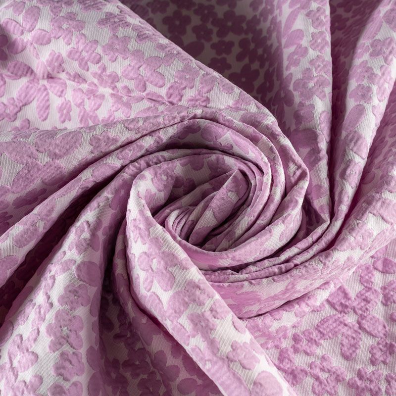 Молочный рельефный фон итальянского жаккарда дополнен узором из объемных разновеликих цветов простой формы нежного розового оттенка. Ткань легкая, средней плотности, не просвечивает, не тянется. Хорошо держит форму и драпируется. Идеально подойдет для платьев различных силуэтов, костюмов, жакетов, юбок, шорт, легких пальто.