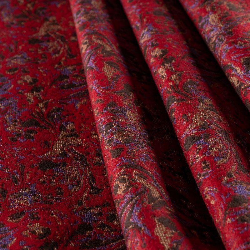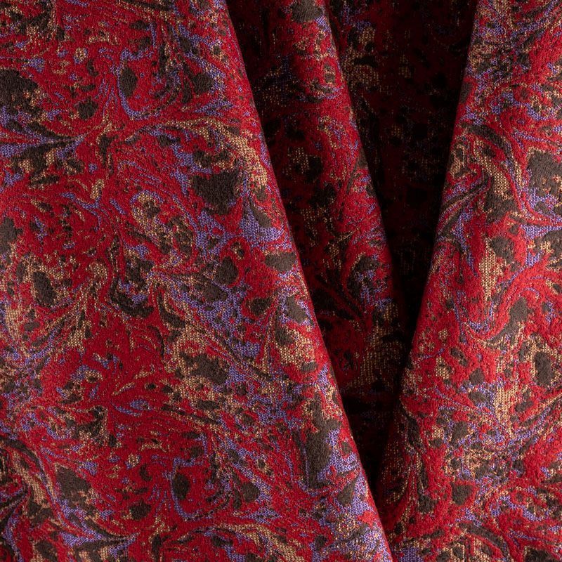 Итальянский пальтовый шерстяной жаккард красного цвета с пестрым узором, который создает оригинальный объемный эффект. Фактура ткани напоминает тканое полотно, ткань плотная, практичная и прочная. Она хорошо держит форму, небольшое количество эластана повышает ее растяжимость. Отлично подойдёт для пошива утепленного или легкого пальто, жилета, жакета, юбки.