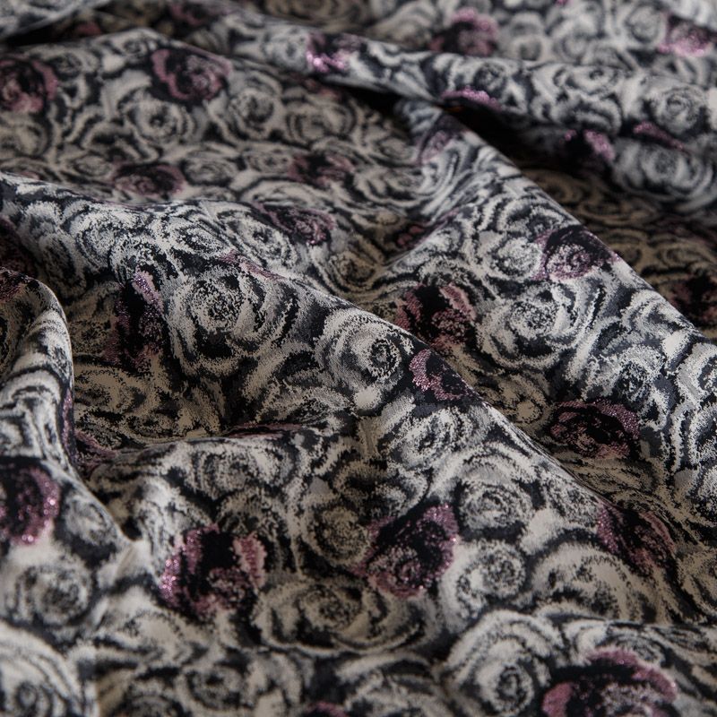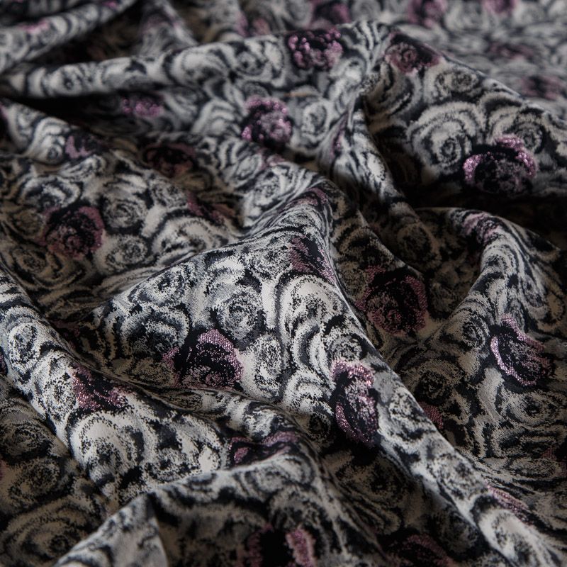 Итальянский жаккард с добавлением люрексовой серебристой нити с цветочным дизайном. Ткань легкая, но плотная, поверхность матовая, фактурная, хорошо драпируется и держит форму, тянется и не просвечивает. Подойдет для пошива нарядных вечерних костюмов, платьев-футляров в стиле Dior, жакетов, топов, летних пальто, бомберов, юбок или шорт.